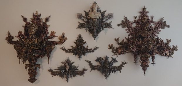 Geïnspireerd door barok, neoklassiek, ornamenten en oude constructies creëer ik assemblages van allerlei materialen, waarbij een centraal figuur wordt omringd door vormen en gedaantes.